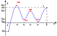 Na przedstawionym rysunku funkcja f w punktach x1 i x3 ma maksimum lokalne, a w punktach x2 i x4 minimum lokalne. Jednocześnie zauważmy, że najmniejszą wartością tej funkcji w przedziale [a, b] jest f(a), a największą f(x1). Tak więc w przedziale [a, b] funkcja f osiąga w punkcie x=a minimum globalne (mimo, że nie jest to minimum lokalne!), a w punkcie x=x1 maksimum globalne.