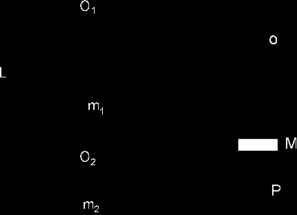 W celu wyznaczenia przyspieszenia ziemskiego posługujemy się wahadłem rewersyjnym, które miało postać stalowej sztaby na której znajduje się obciążnik M w kształcie dysku (rys.2). Istniała możliwość przesuwu obciążnika M i odczytu jego położenia na skali naniesionej na sztabę. Dwa pryzmaty przymocowane prostopadle do sztaby pełnią role osi zawieszenia O i P. Odległość osi jest zatem w doświadczeniu ustalona. Przesuwanie obciążnika wzdłuż sztaby powoduje zmianę położenia środka ciężkości wahadła względem osi.
