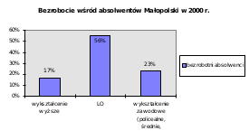 Corocznie małopolskie szkoły opuszcza ponad 80 tysięcy absolwentów, z czego 40 % trafia na bezrobocie. W minionym roku spośród kończących wyższe uczelnie w urzędach zarejestrowało się 17 %, szkoły zawodowe (policealne, średnie i zawodowe) ok.56 %, a licea ogólnokształcące 23%. Widać więc, że wraz ze wzrostem poziomu wykształcenia zmniejsza się poziom bezrobocia wśród absolwentów. Ogólne dane za rok 2000 przedstawia poniższy wykres:
