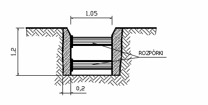 WYKONANIE ŚCIANEK PROWADZĄCYCH – Zagłębienie ścianek prowadzących przyjęto na głębokość 1,2 m. Wierzch ścianek zaprojektowano 0,25 m powyżej projektowanej rzędnej wyrównanego wierzchu ściany szczelinowej, w celu umożliwienia ułożenia betonu z nadmiarem, (który później zostanie usunięty). Odstęp w świetle ścianek prowadzących wynosi 1,05 m (tyle co szerokość narzędzia głębiącego + 5 cm). Powierzchnie wewnętrzne ścianek powinny być pionowe z niewielkim skosem w górnej części, ułatwiającym wprowadzenie narzędzia głębiącego. Górna granica ścianek powinna być pozioma i wyrównana. Ścianki zostały zaprojektowane z betonu B15. Ścianki prowadzące są tak zaprojektowane, aby były łatwe w demontażu po wykorzystaniu.