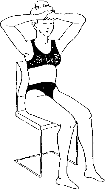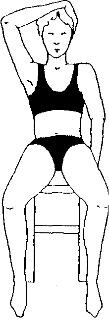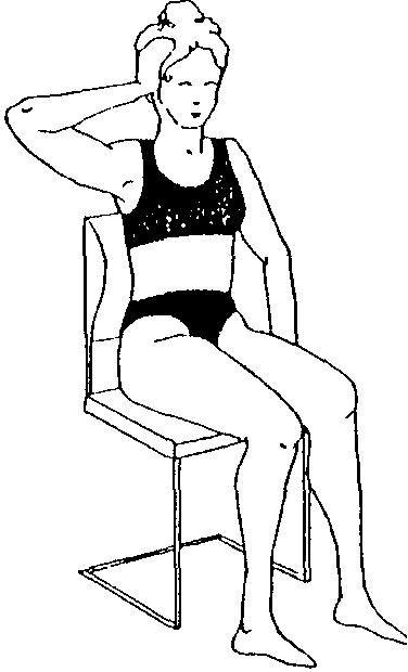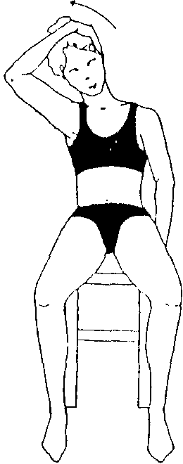 P.W. - siad prosto na krześle. lewa dłoń trzyma krawędź krzesła, prawa dłoń na lewej skroni. Ruch - nacisnąć dłonią na skroń i skronią na dłoń taką samą siłą bez zmiany pozycji głowy, napięcie wytrzymać 6 s., rozluźnić, łagodnie przyciągnąć głowę w prawą stronę aż do odczucia rozciągania lewej strony szyi i karku, to samo lewa strona.