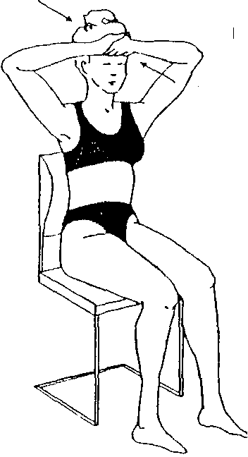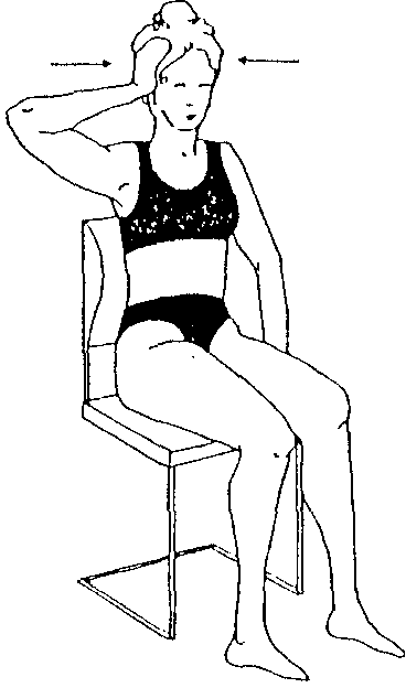 P.W. - siad prosto, na krześle, lewa dlań trzyma krawędź krzesła, prawa dłoń na prawej skroni. Ruch - nacisnąć dłonią na skroń i skronią na dłoń taką samą silą bez zmiany pozycji głowy, napięcie wytrzymać 6 s., to samo druga strona.