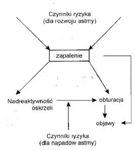 Makrofagi płucne uczestniczą w miejscowej reakcji alergicznej, w tym być może w indukcji EAR. Jak wspomniano, posiadają receptory Fc R II. Mogą uwalniać miejscowo m.in. LTB4, C4, D4, PGD2, F2a, PAF, obojętne proteazy, cytokiny (np. IL-1, TNFa, GM-CSF) i wolne rodniki tlenowe. Podsumowując, główną komórką odczynową w ostrej fazie skurczu oskrzeli wywołanego alergenem lub wysiłkiem fizycznym są mastocyty. Natomiast w stanach przewlekłego zapalenia dróg oddechowych w astmie oskrzelowej, pierwszoplanowa rola przypada raczej eozynofilom. Aktywność eozynofilów i mastocytów w astmie zależy od stymulującej roli komórek Th2. Ponadto limfocyty i makrofagi mogą utrwalać odczyn zapalny toczący się w ścianie oskrzeli. Rola granulocytów obojętnochłonnych jest nie do końca poznana. Reakcja alergiczna w układzie oddechowym przebiega dzięki działaniu mediatorów wydzielanych lub syntetyzowanych de novo przez komórki zapalenia. Mediatory te powodują skurcz oskrzeli, hipersekrecję śluzu i wzrost przepuszczalności naczyń krwionośnych i w efekcie: obrzęk podśluzówkowy, wzrost oporu oskrzelowego oraz nadreaktywność drzewa oskrzelowego. Do najważniejszych mediatorów, biorących udział w patogenezie astmy oskrzelowej należą: histamina, produkty metabolizmu kwasu arachidonowego (leukotrieny i prostaglandyny, które same mogą powodować nadreaktywność oskrzeli) i czynnik aktywujący płytki (PAF). Przewlekła reakcja zapalna prowadzi również do uszkodzenia ściany oskrzeli i złuszczania komórek nabłonka. W wyniku procesów naprawczych dochodzi do przebudowy (remodeling) ściany oskrzeli: zgrubienia błony podstawnej (jej warstwy siateczkowatej), przerostu mięśniówki, proliferacji fibroblastów, przerostu gruczołów śluzowych i komórek kubkowych wytwarzających śluz oraz rozplemu naczyń. Nasilenie tych procesów może prowadzić z czasem do nieodwracalnej obturacji oskrzeli.