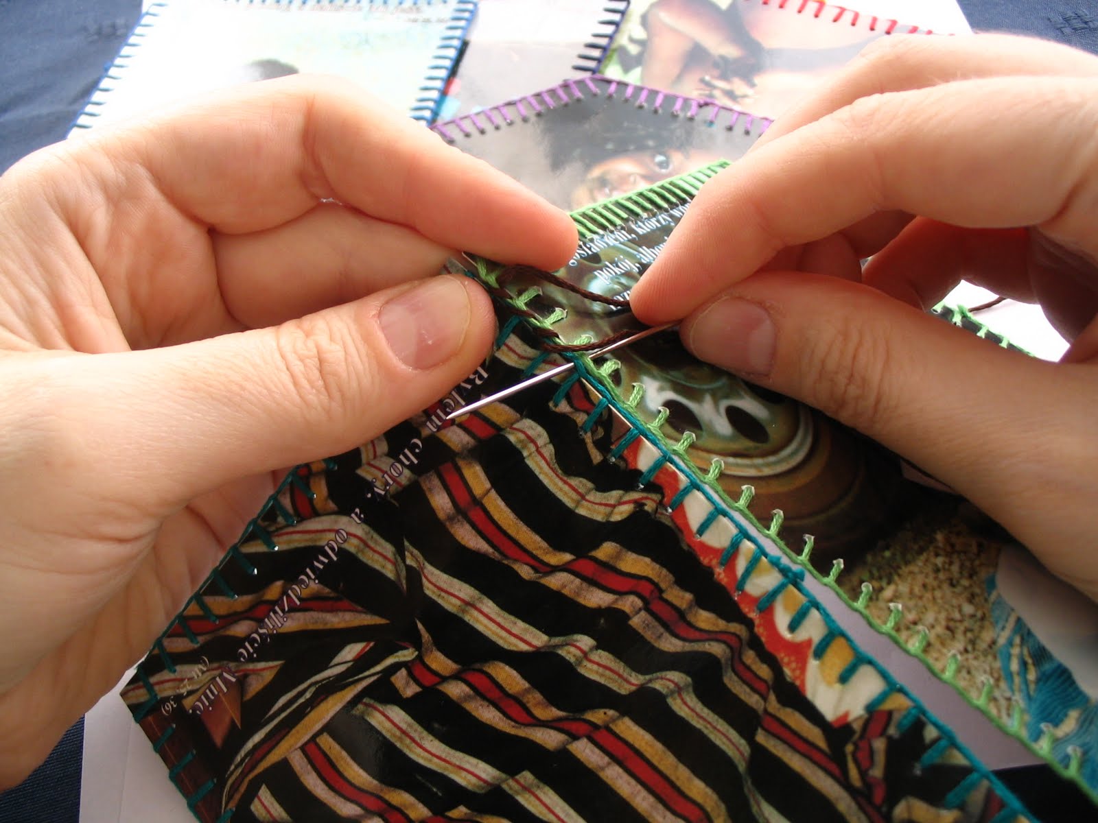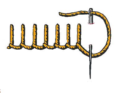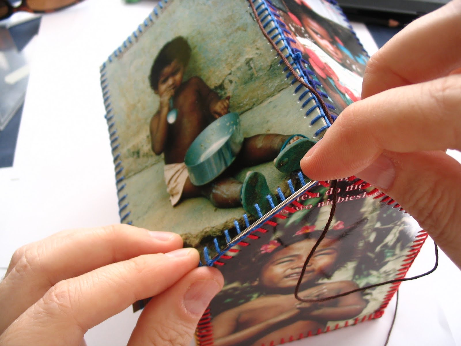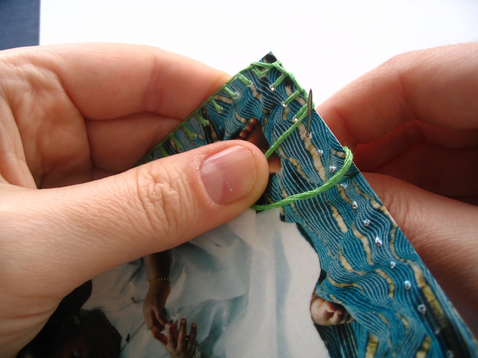 2. Ścianka przednia, tylna, spód oraz daszek: po dwie pocztówki zszyj ze sobą kolorową stroną na zewnątrz ściegiem jak na rysunku